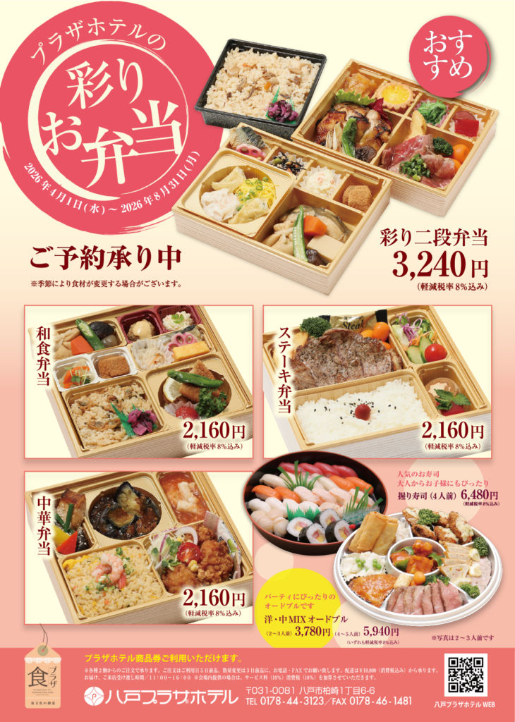 料理人が自信をもってお作りする八戸プラザホテルの彩りお弁当。
