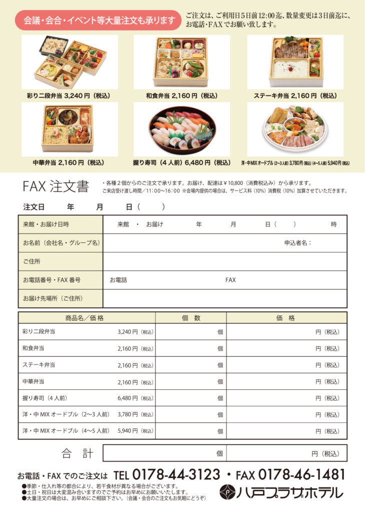 ※ご注文はご利用日5日前12:00迄、数量変更は2日前迄にお電話・FAXでお願い致します。