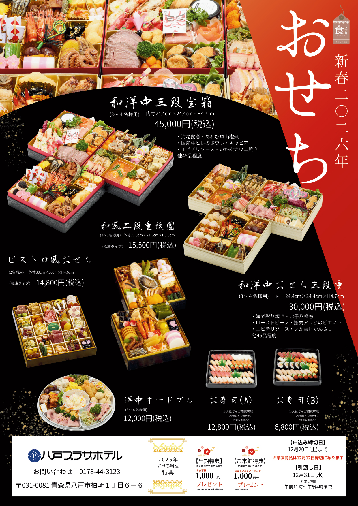 八戸プラザホテルのおせち料理とオードブルをご賞味くださいませ。